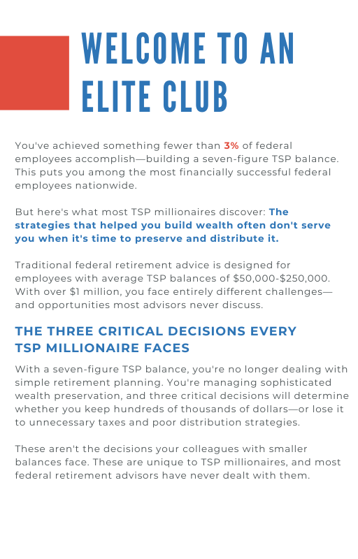 If your TSP balance is approaching or above $1 million, this 18-page guide outlines key considerations for managing risk, planning distributions, and coordinating your benefits in retirement.